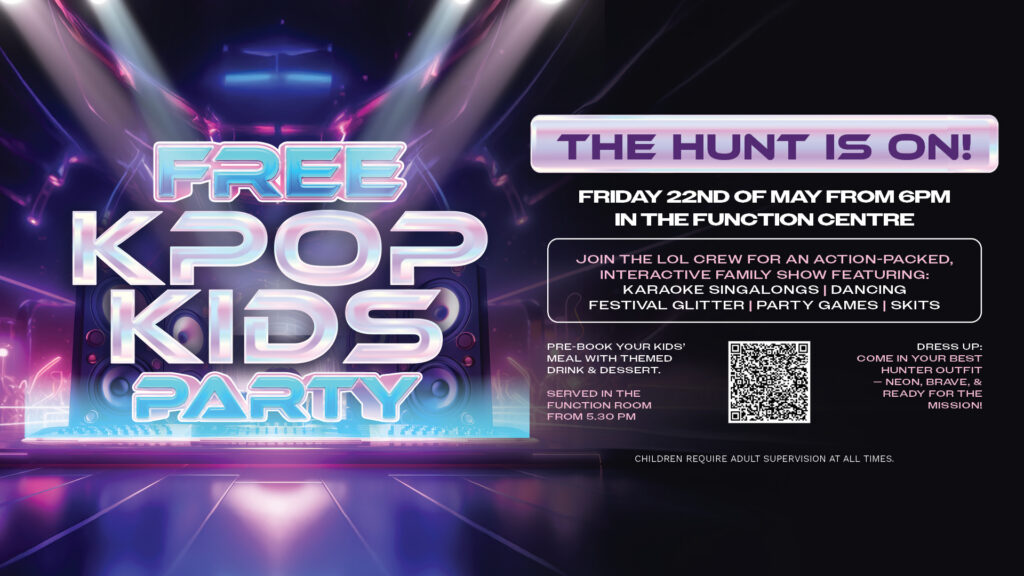 Get ready for a high-energy night of music, fun and adventure at Club Helensvale’s FREE KPOP Kids Party! Join the LOL Crew for an action-packed interactive family show featuring karaoke sing-alongs, dancing, festival glitter, party games and skits, all inspired by the exciting world of KPOP Demon Hunters.