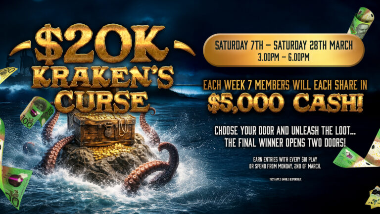 Running Saturday 7th to Saturday 28th March, from 3pm – 6pm, $20K Kraken’s Curse is your chance to chase deep-sea treasure. Each week, 7 members share $5,000 cash and step up to choose a door to unleash the loot, with the final winner getting to open two doors for an even bigger haul!